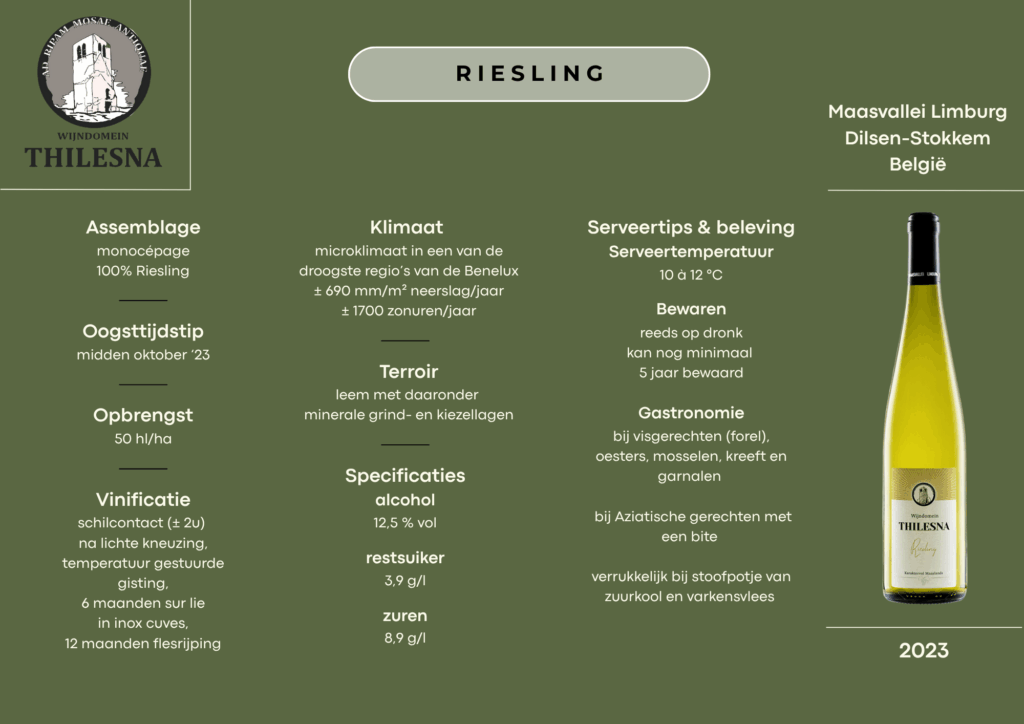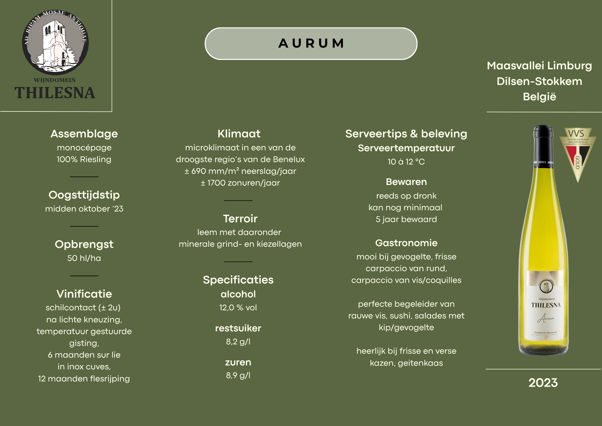 Onze Riesling en Aurum krijgen wat meer tijd om zich te ontwikkelen. Na 6 maanden rijping op inox cuves blijft de wijn nog eens 12 maanden op fles rusten in onze kelders. Dat geduld wordt beloond met verfijnde aroma’s en een mooie diepgang.