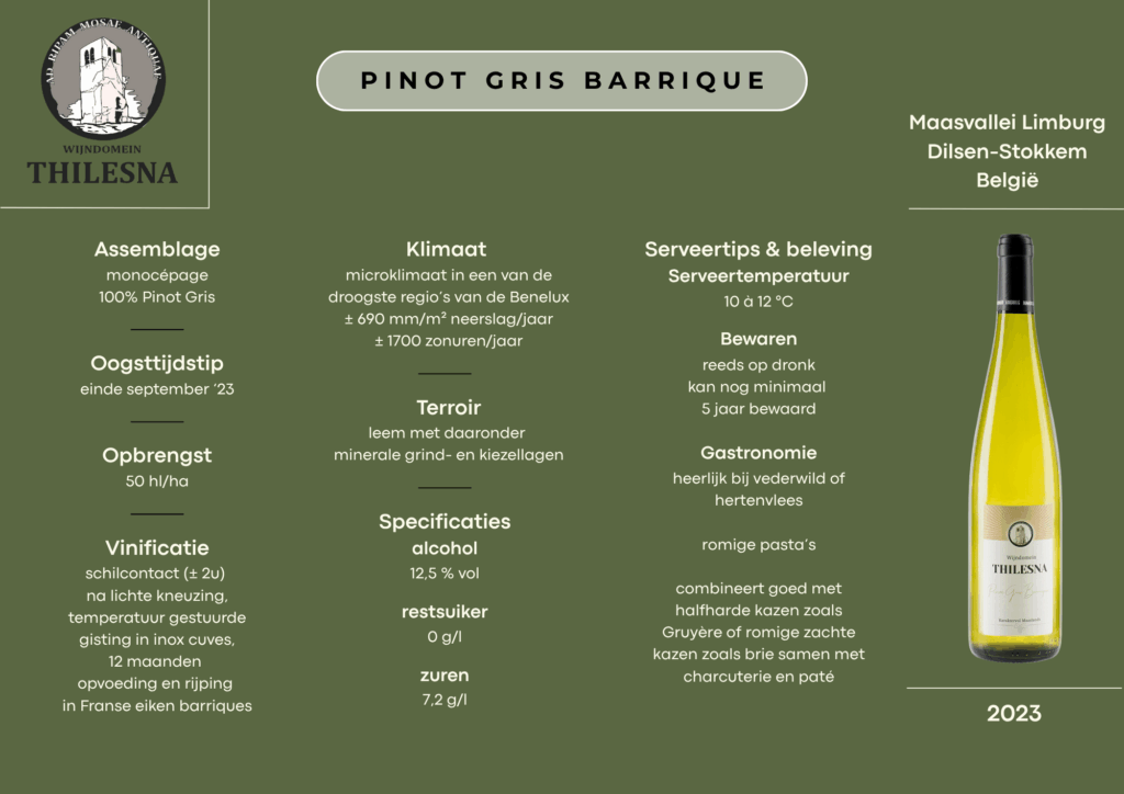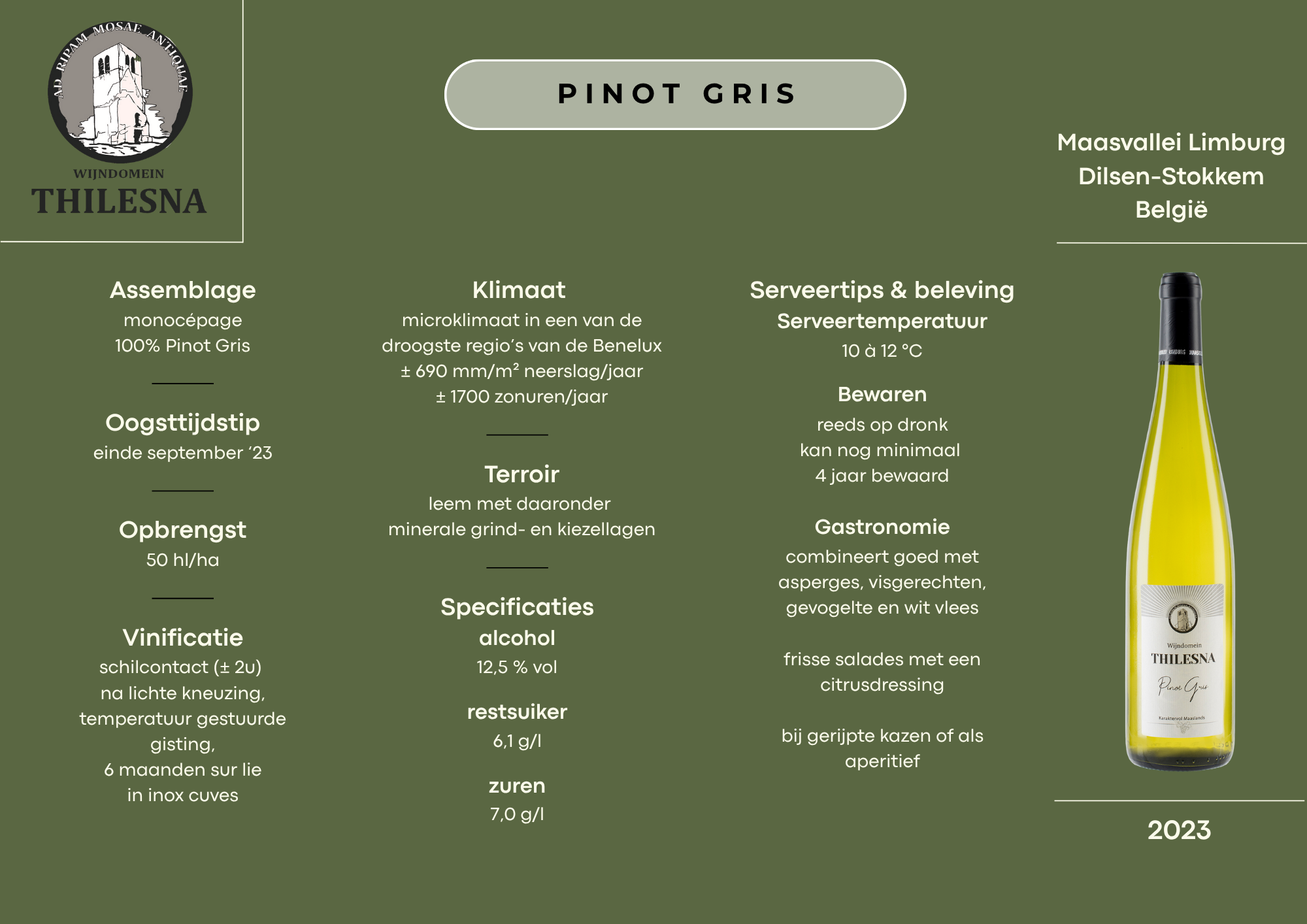 In de Maasvallei Limburg toont Pinot Gris een bijzonder frisse en elegante kant, met levendige zuren en een fijne mineraliteit.